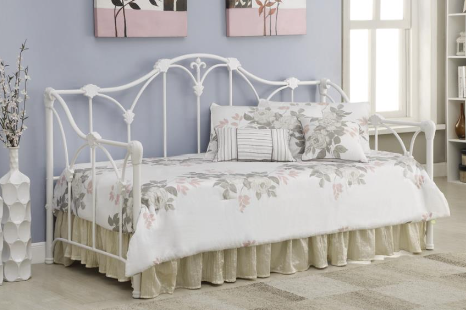 Add a dash of romance and glamour to any bedroom in your home. The sleek metal frame of this exquisite daybed creates a stunning silhouette of gracefully curved lines. An elegant white finish adds an extra touch of sophisticated style. Ideal for a child's room or spare bedroom, its compact size fits nicely into small spaces. This bed comes complete with a link spring for sturdy, comfortable support. Mattress sold separately.
