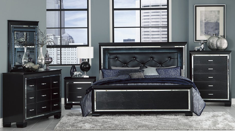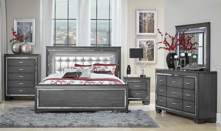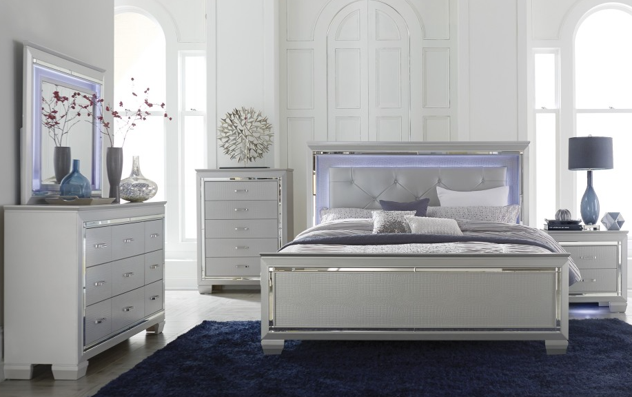 4 piece LED Allura bedroom set includes bed frame, nightstand, dresser and mirror. Mattress sold separately.