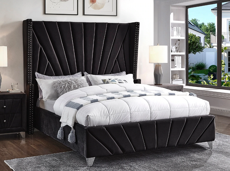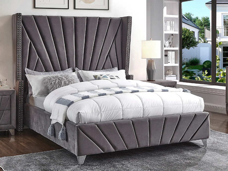 Velvet bed frame available in gray or black. Mattress sold separately.