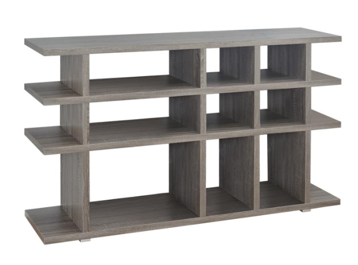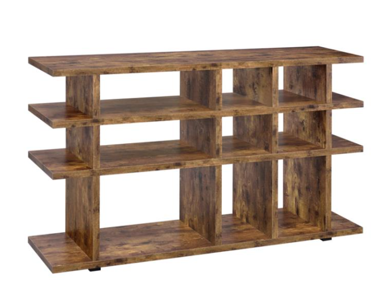 * Modern rustic bookcase in antique nutmeg offers geometric interest with divided shelves of varying sizes