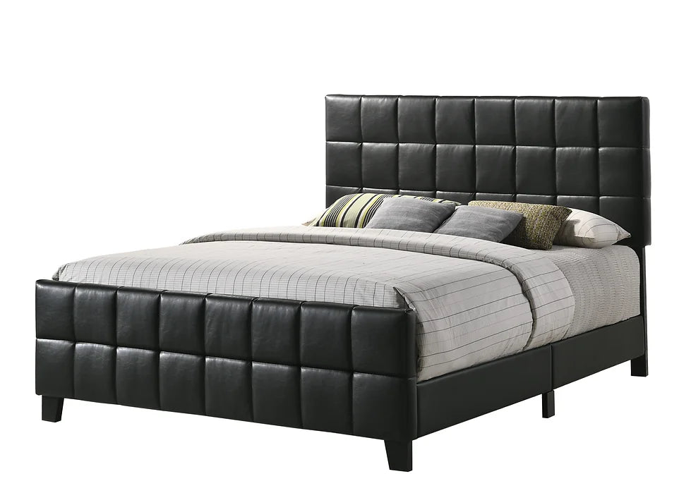Black faux leatherette bed frame with box tufting.