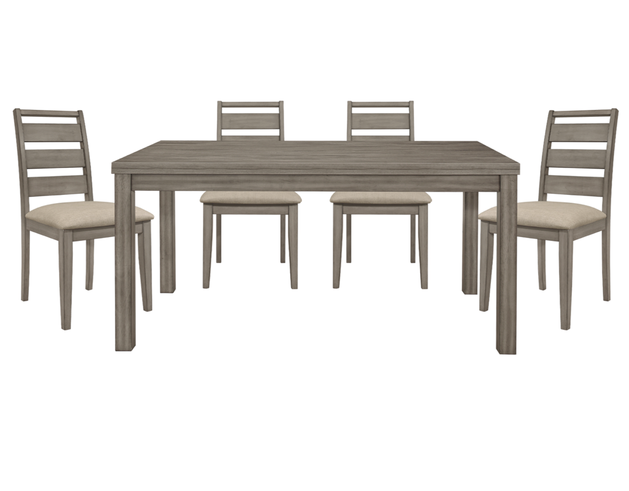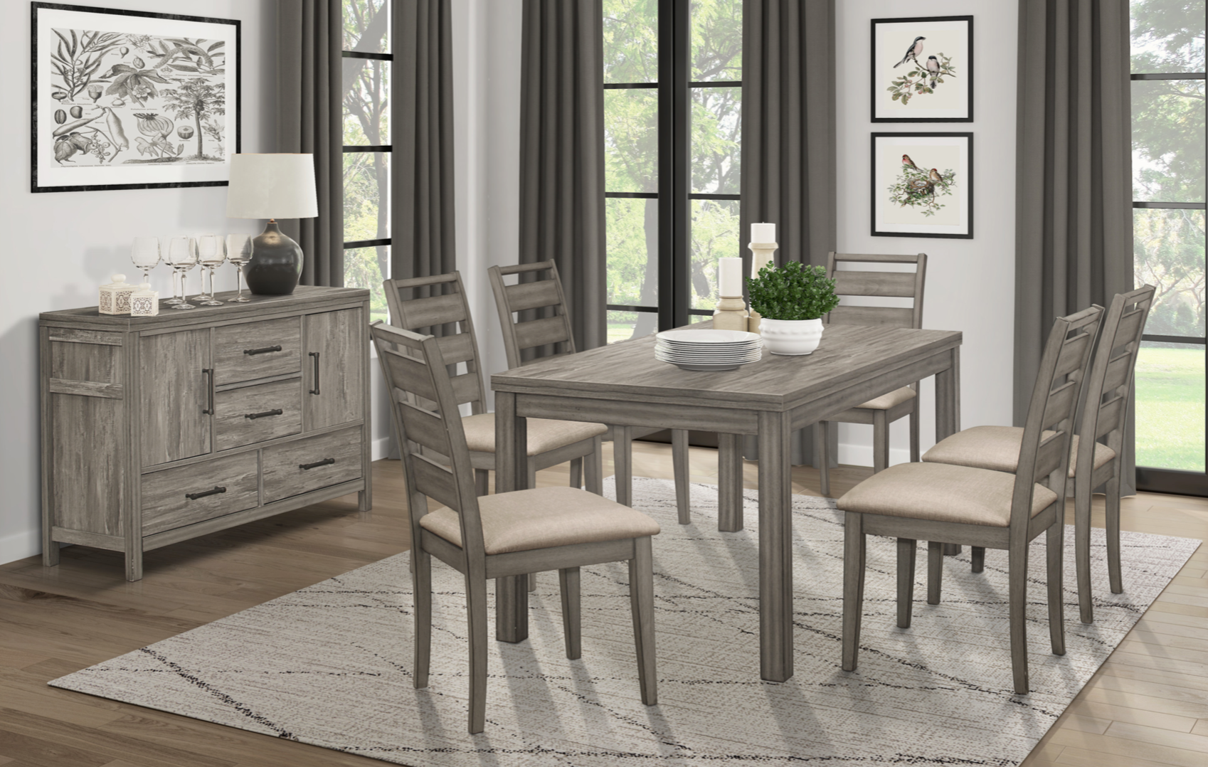 Following the trend of rusticated simplicity is the Bainbridge Collection. Melamine laminate perfectly mimics the look of weathered gray wood, lending to the rustic style. The transitional framing of the collection allows for placement in myriad casual dining room settings, creating the perfect canvas for your preferred decorative style. The fixed-top table and coordinating chairs - which feature gray fabric padded seats – seats six comfortably. Black metal bar hardware fronts the doors and drawers of the coordinating server, providing complementing contrast to the gray finish.