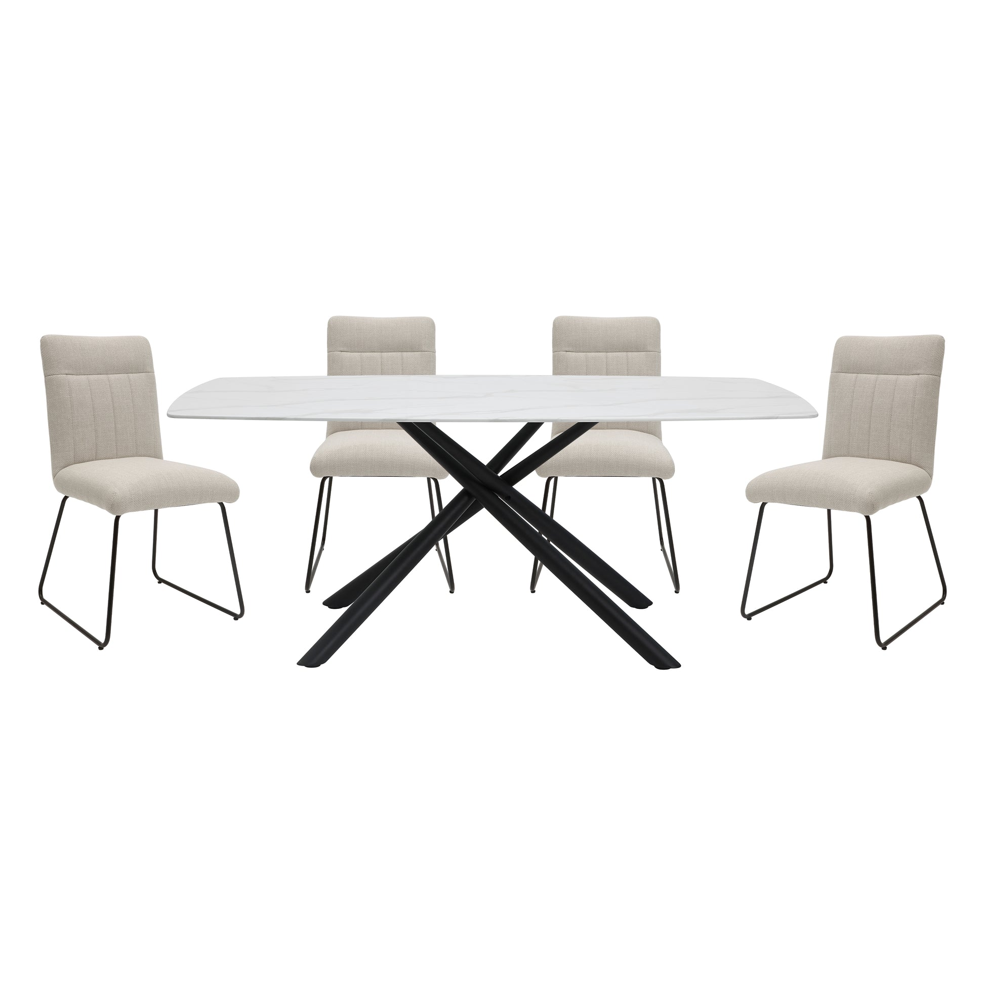 Refined and modern, The Benito Collection's design features white marble print tempered glass and black-finished metal legs. The side chair is accented with a beige textured fabric seat for added style.