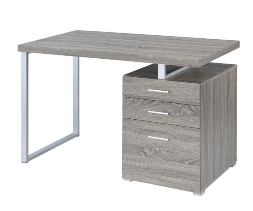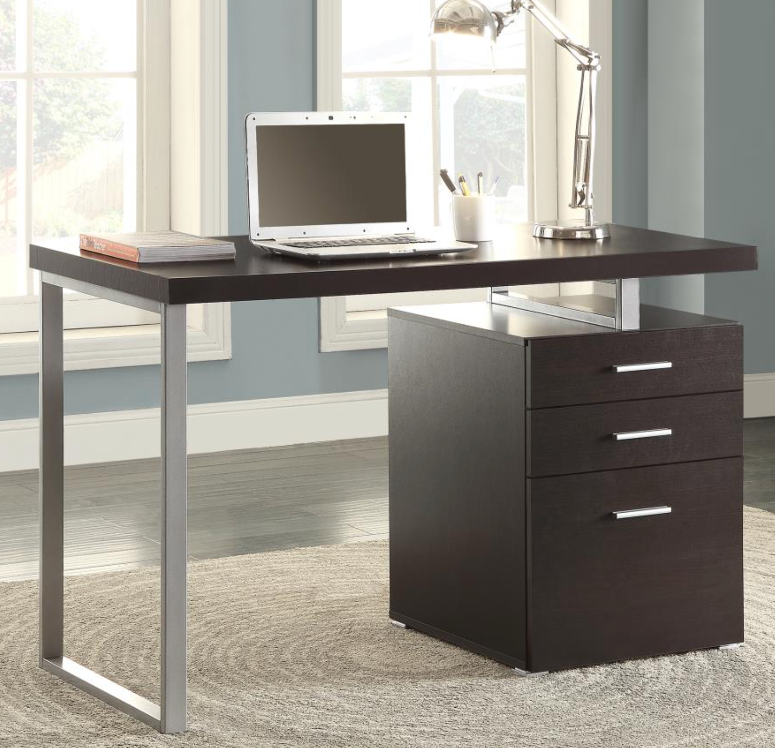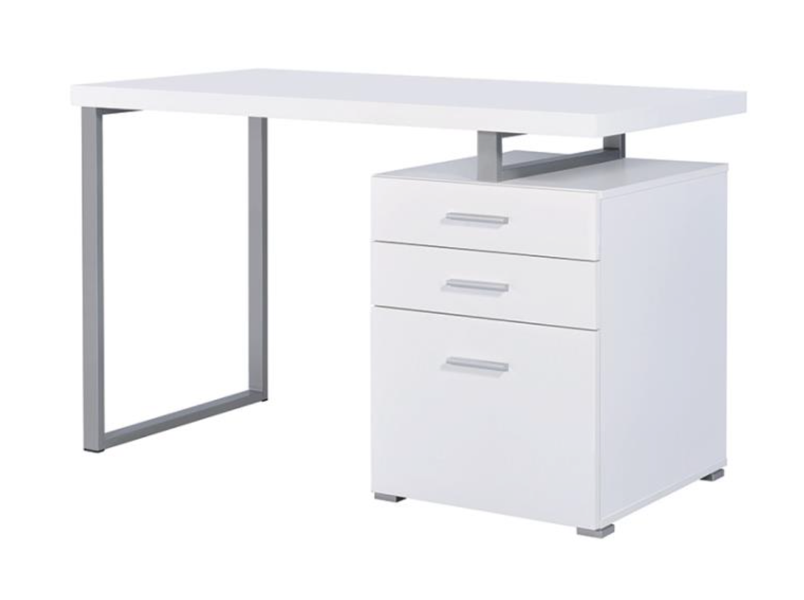 Update your home office with contemporary glamour. This office desk boasts a chic, trendy silhouette. A sturdy metal frame with a cool silver finish elegantly complements its sleek design. Three convenient drawers include a large file cabinet with space for both legal and letter size documents. Available in finishes of white, cappuccino, or weathered grey, there's an option to blend with the decor of any home.