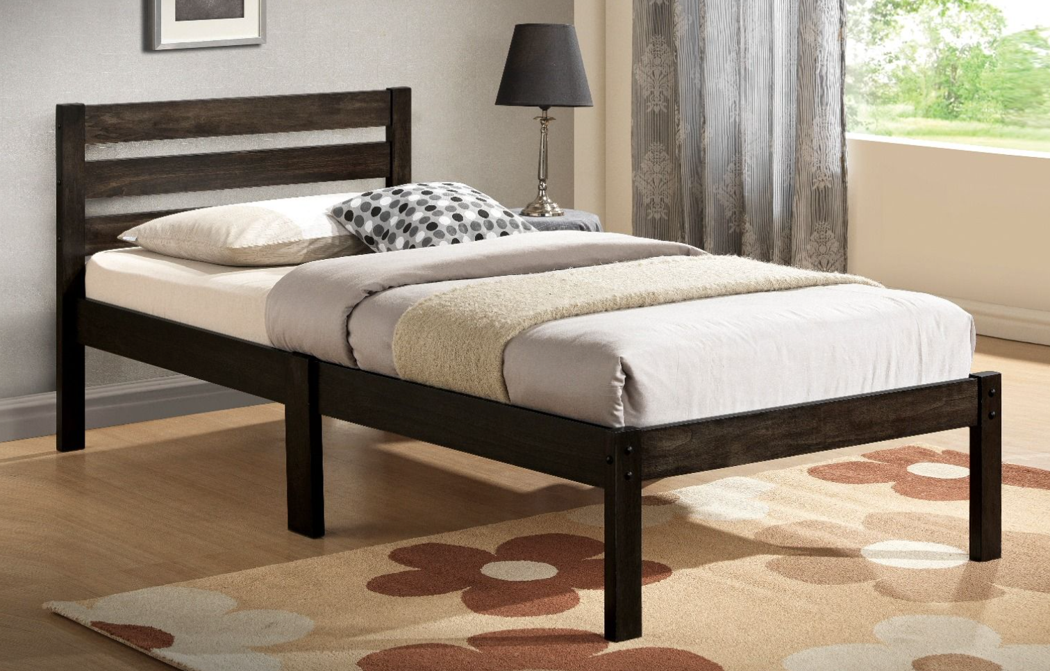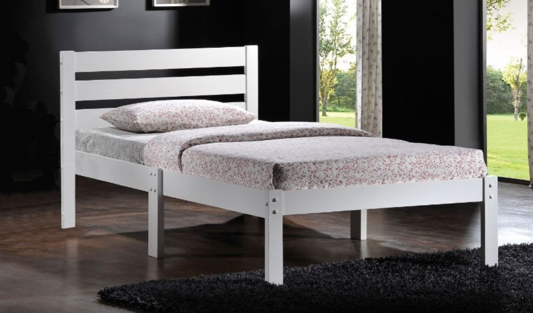 Twin size Donato bed frame features wooden slatted headboard, low profile footboard, crafted with selected wood. Box Spring not required.