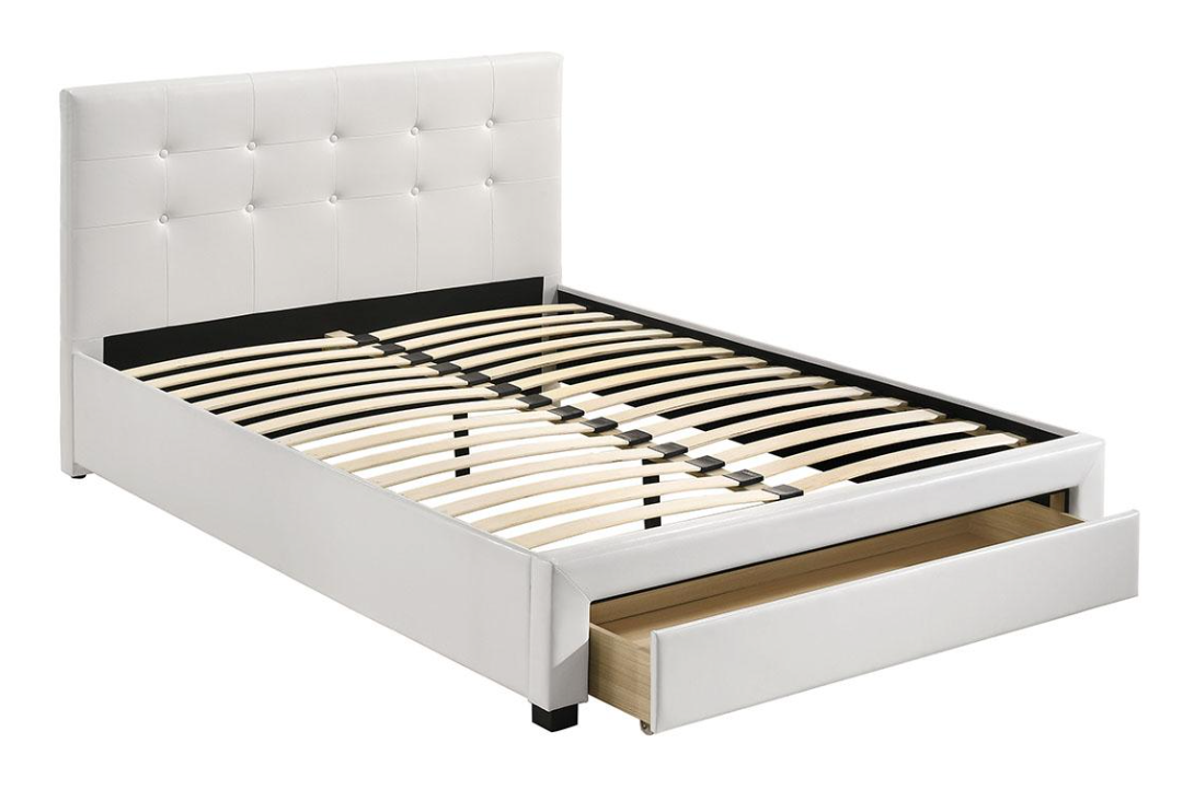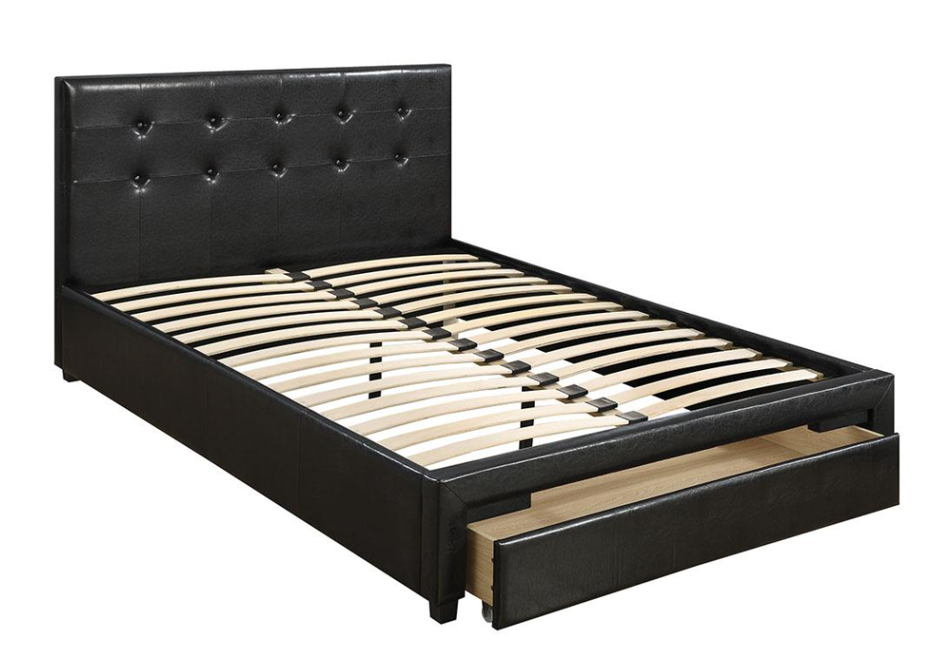 Available in white or black leatherette with storage drawer. Mattress sold separately.