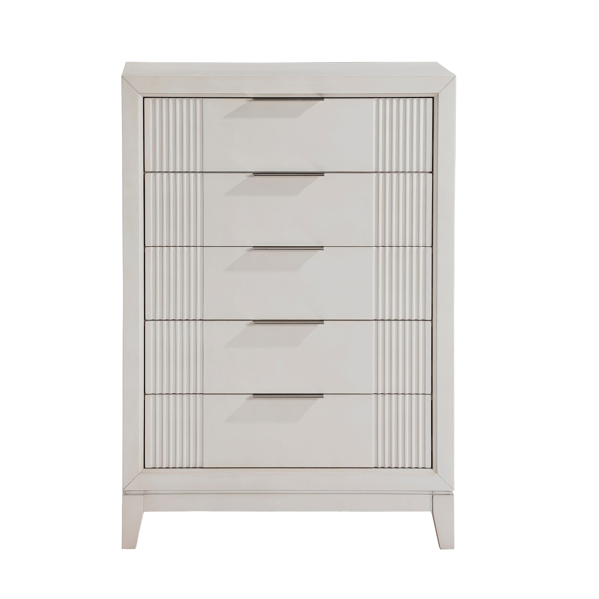 The Florence Bedroom Set combines modern and classic design with its ivory padded LED headboard, matching footboard, and coordinating dresser, nightstand, and chest. Reeded accents and polished chrome hardware add refined detail, while the antique white finish brings a fresh, sophisticated look to your bedroom.