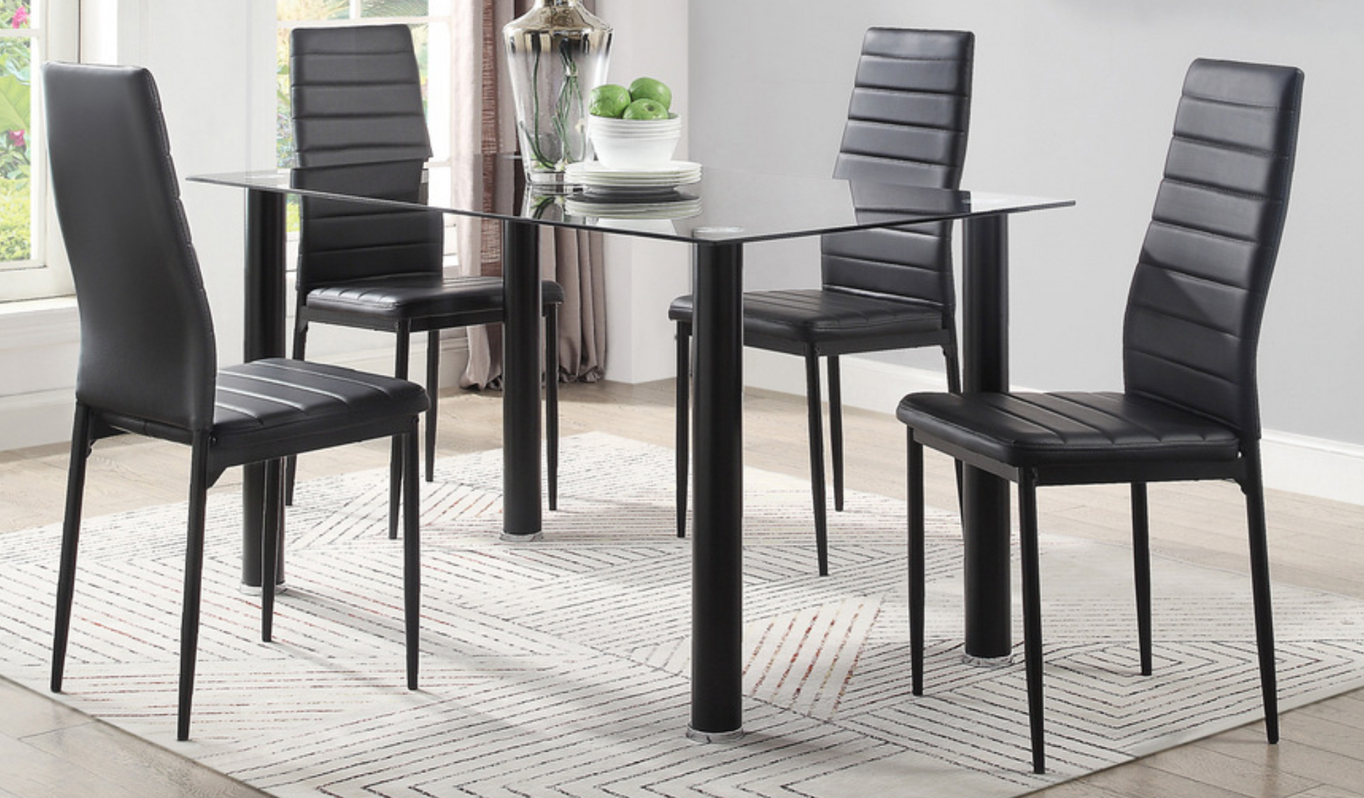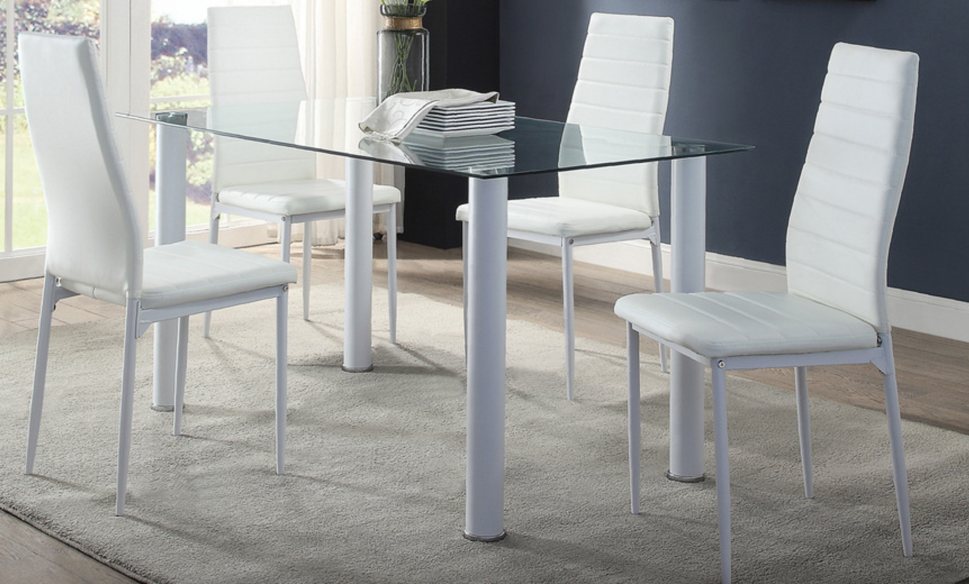 Florian dining set includes glass table and 4 faux leather chairs. Available in black or white.