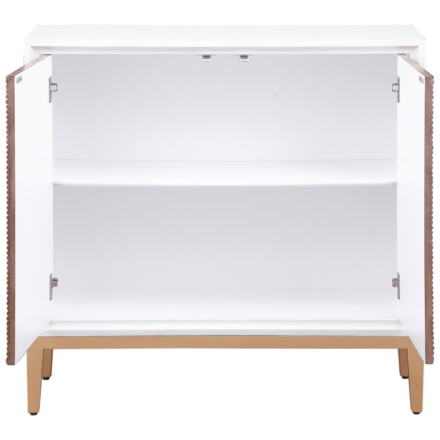 Enhance any room with this contemporary accent cabinet. It has two doors and an adjustable shelf for organization in your entry, living area, den, or bedroom. White finish with light brown geometric designs and matching base and legs add character and style.