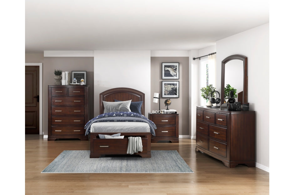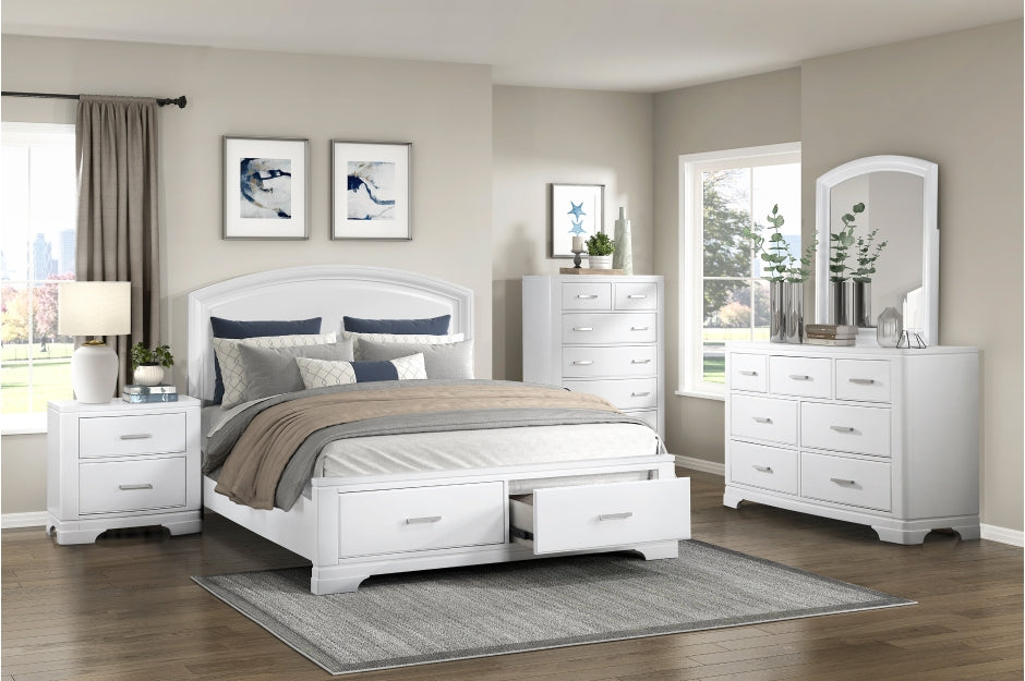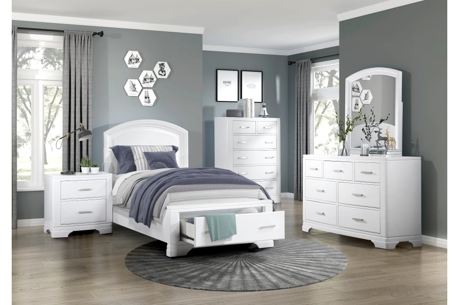 The Hudson Collection combines modern and transitional styles, available in cherry or white finishes. It features polished chrome handles on the dresser, chest, nightstand, and bed footboard drawers. The bed’s curved headboard design is echoed in the mirror’s top rail, adding a cohesive touch to your bedroom.