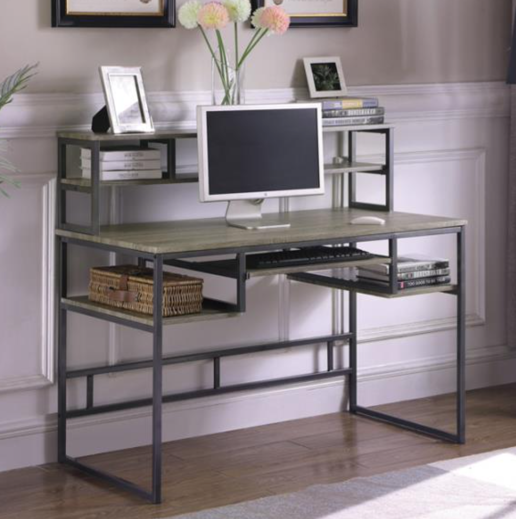 Add an eye-catching element of modern charm to your home office. Creatively crafted, this computer desk exudes contemporary flair. Its frame is designed with bold, geometric shapes, creating a striking silhouette. Its weathered taupe finish creates an appealing contrast to its gunmetal finish frame. Complete with a mini-hutch, keyboard tray, and two open storage compartments, this desk is as versatile as it is stunning.