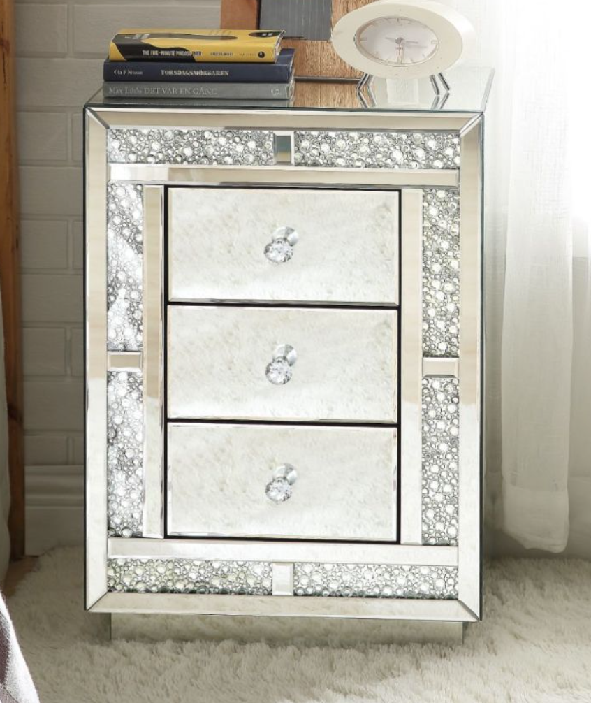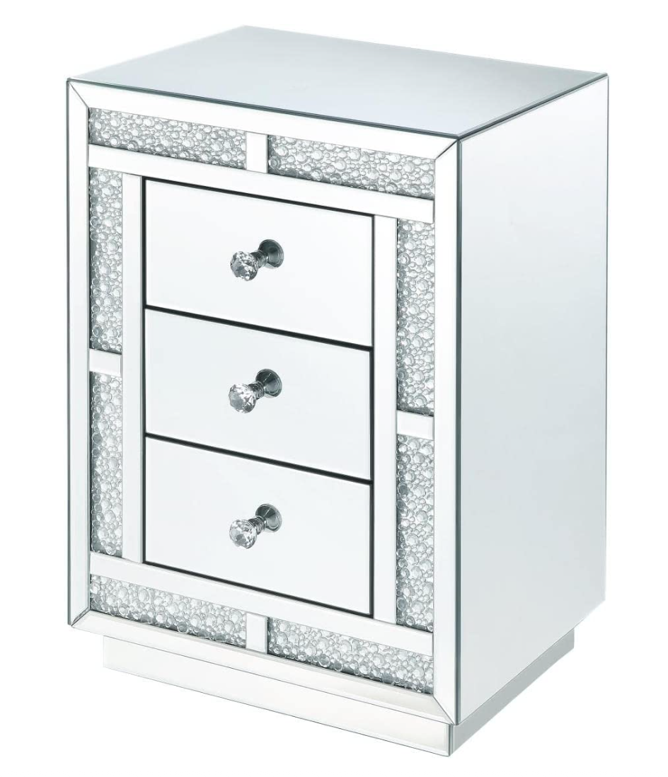Glam up your bedside with the Malika mirrored night table with faux crystal trim. All visible sides of this chic nightstand lined in polished glass mirrors. Three drawers with side metal glide offer easy bedside storage access.