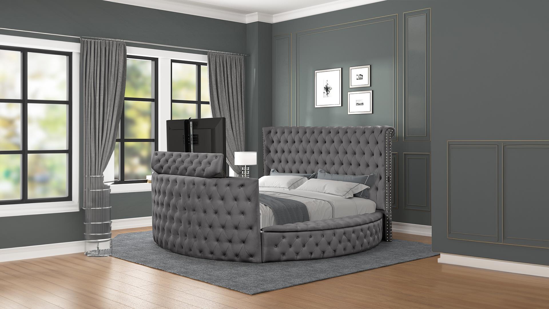 - This Maya Bed Frame's headboard and footboard are luxuriously upholstered in velvet fabric, providing both elegance and comfort. Ample storage on both sides helps keep your space organized, and USB chargers on both sides ensure your devices are always charged and ready. The innovative footboard design also doubles as a TV stand, accommodating up to a 43-inch TV for a queen size and up to a 50-inch TV for a king size. Choose from Blue, Gray, Black, and Cream options. [TV not included].