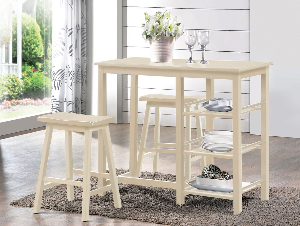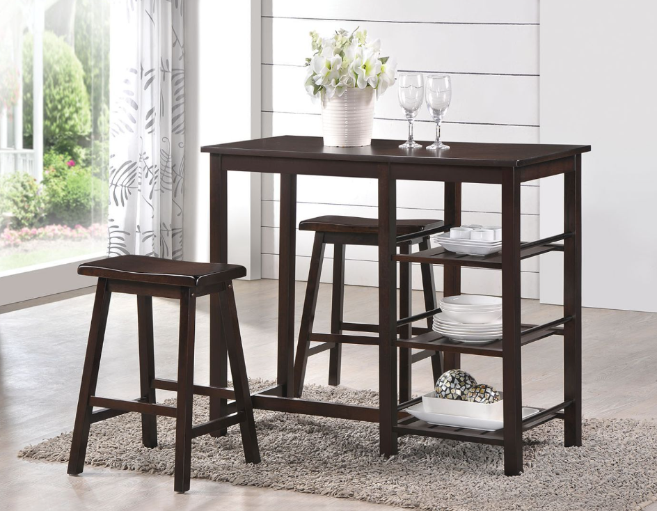 The Nyssa 3 Piece pack breakfast set offers simple lines with a versatility perfect for any small dining space. This breakfast table features a smooth rectangular top, tapered legs, and ample storage shelves perfect for apartments or small kitchen areas. The two matching armless stools include wooden saddle seat, and square legs.