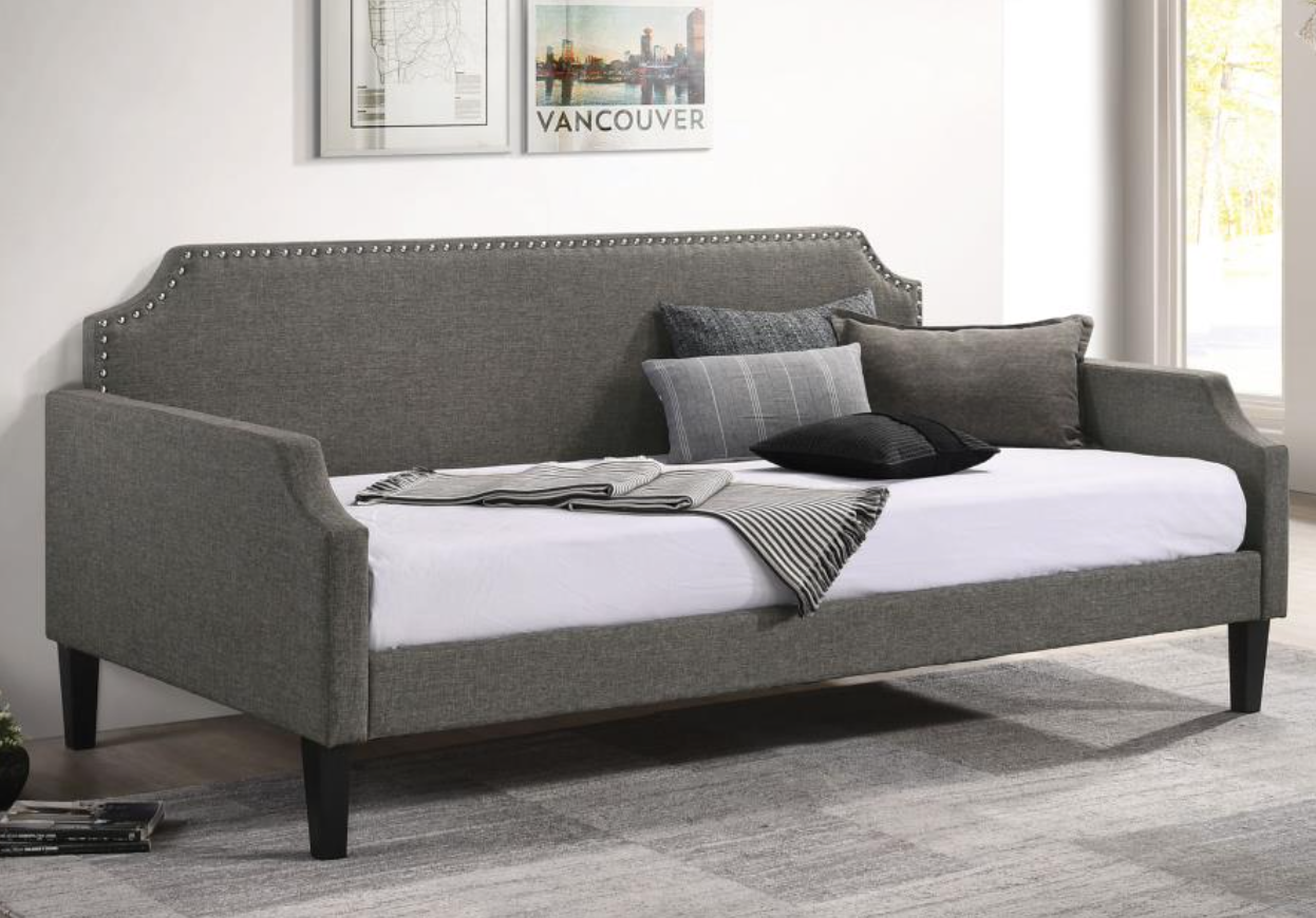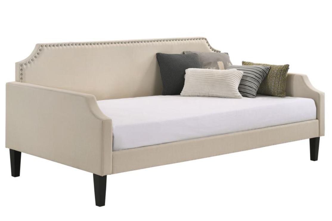 Seamlessly transition this traditional twin daybed into a room, offering extra seating, lounging or sleeping. Covered in a soft fabric, it is as inviting as it is stylish. With scalloped corners along the straight backrest and narrow armrests, this daybed boasts sleek lines and classic elements. Outlining the edge of the backrest is a row of polished chrome nailheads that offer a traditional touch. Elevated by tall and tapered legs in a deep black finish, it adds a dramatic pop against the light hued upholstery and space beneath for storage baskets too.