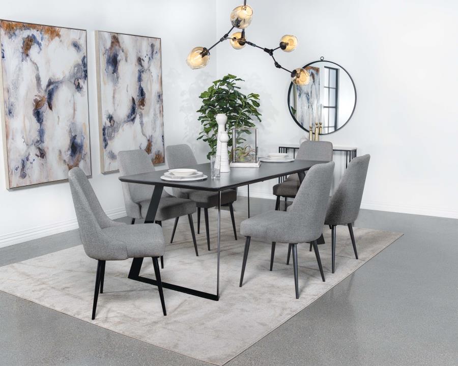Contemporary dining table features a sophisticated black ceramic top and is finished with a powder coated matte gunmetal legs. Chairs feature thin, tapered legs in a gunmetal grey finish. Grey textured fabric covers the back and seat cushions, with a wingback-like silhouette.