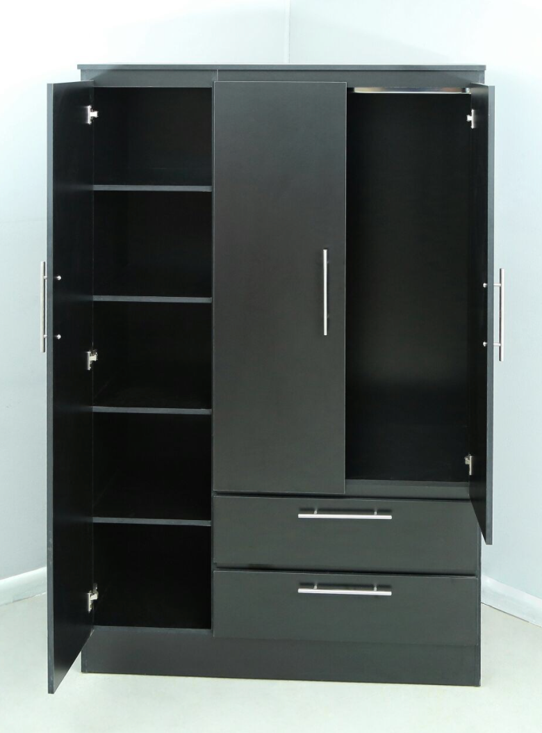 Triple wardrobe with clothing rack, 5 shelves and 2 drawers.