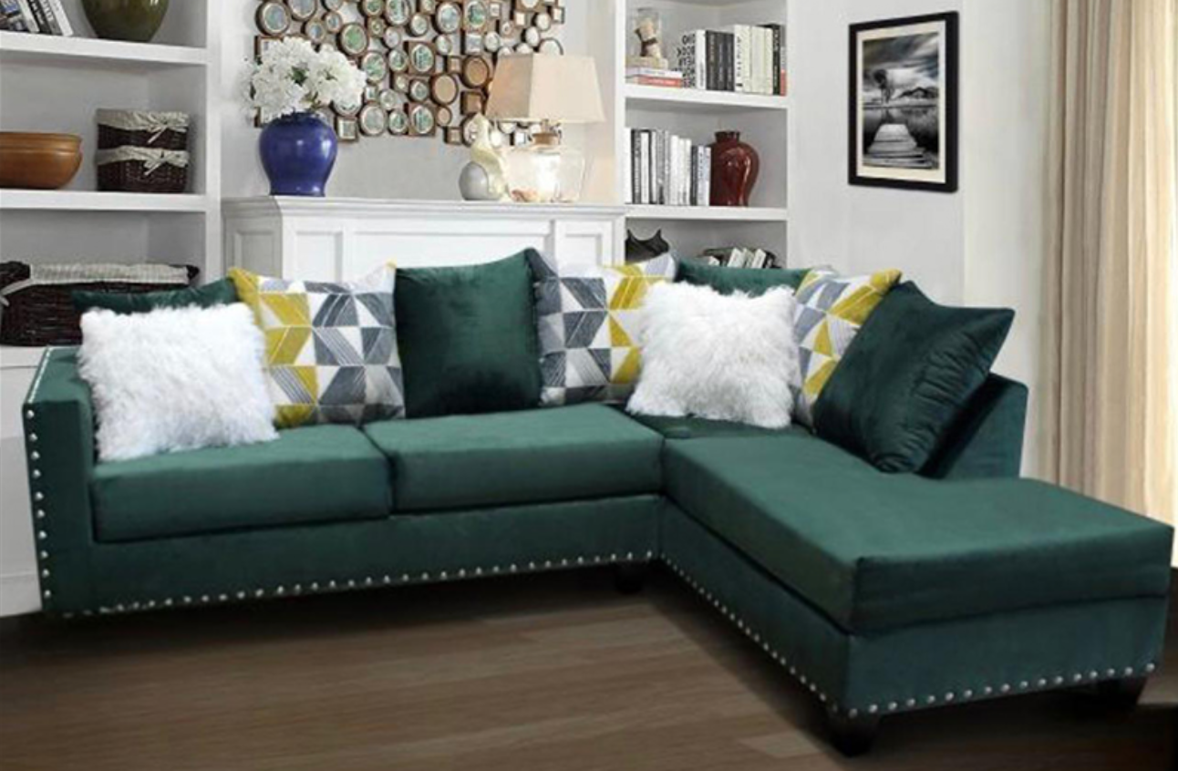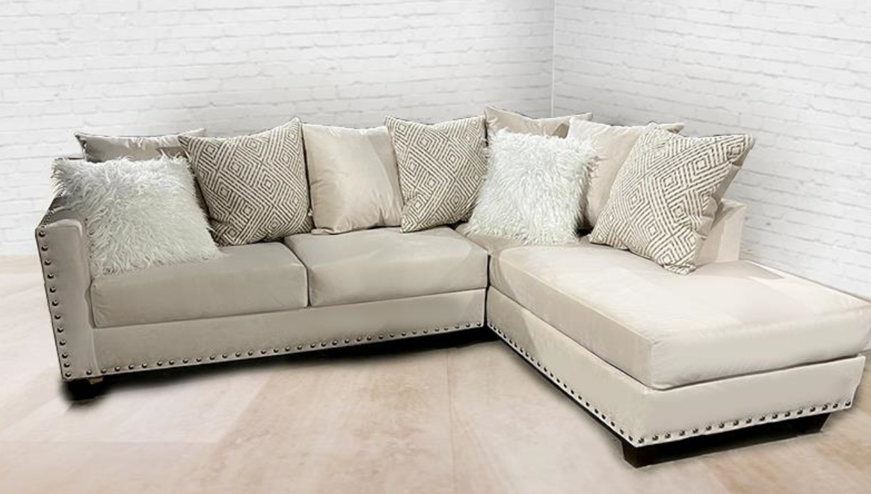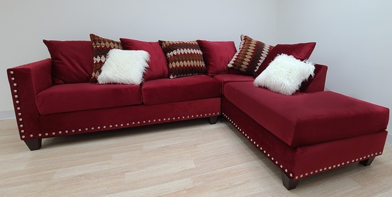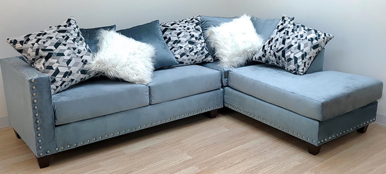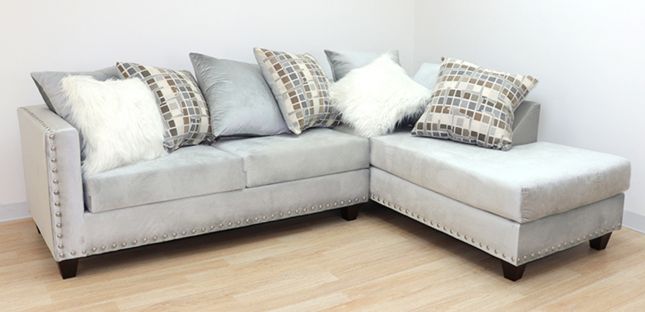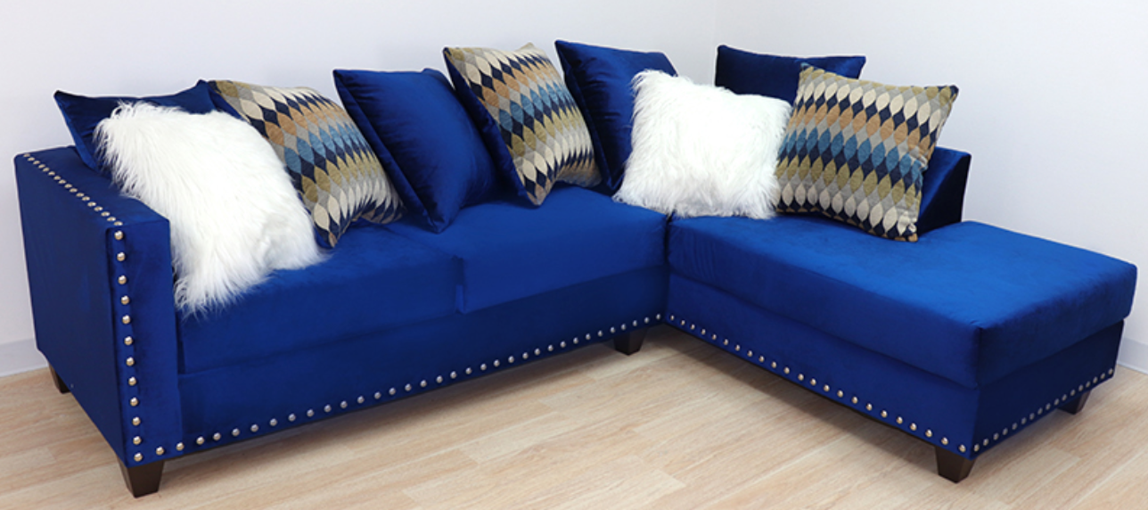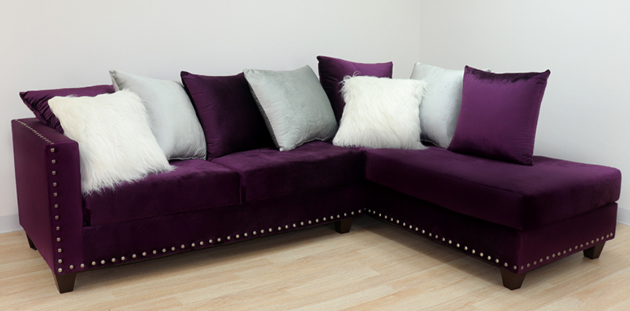 This velvet nailhead sectional comes with accent pillows as shown. Available in black, blue, gray, red, purple, cream and silver.