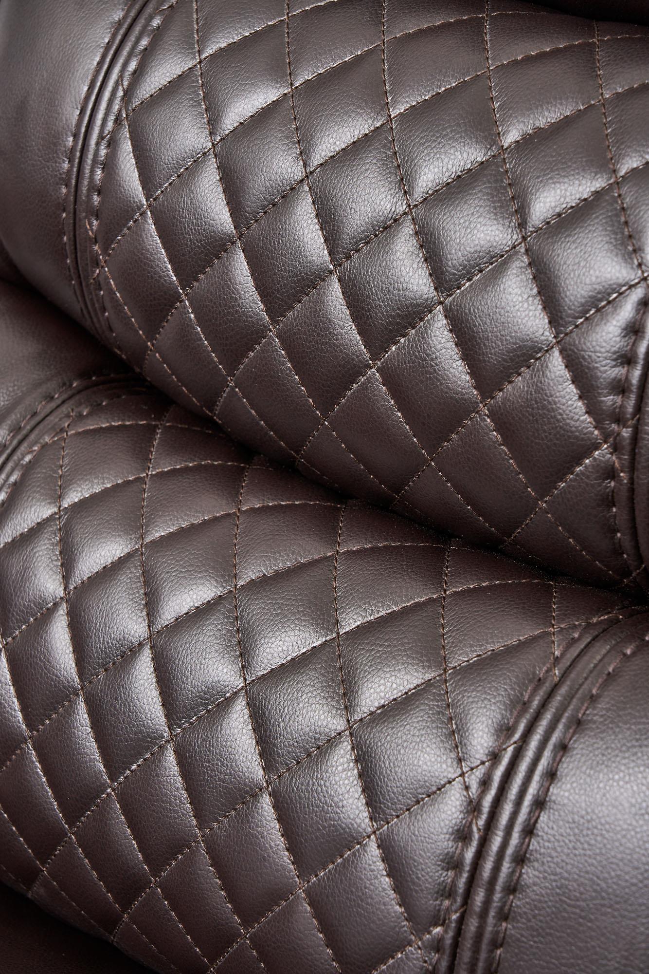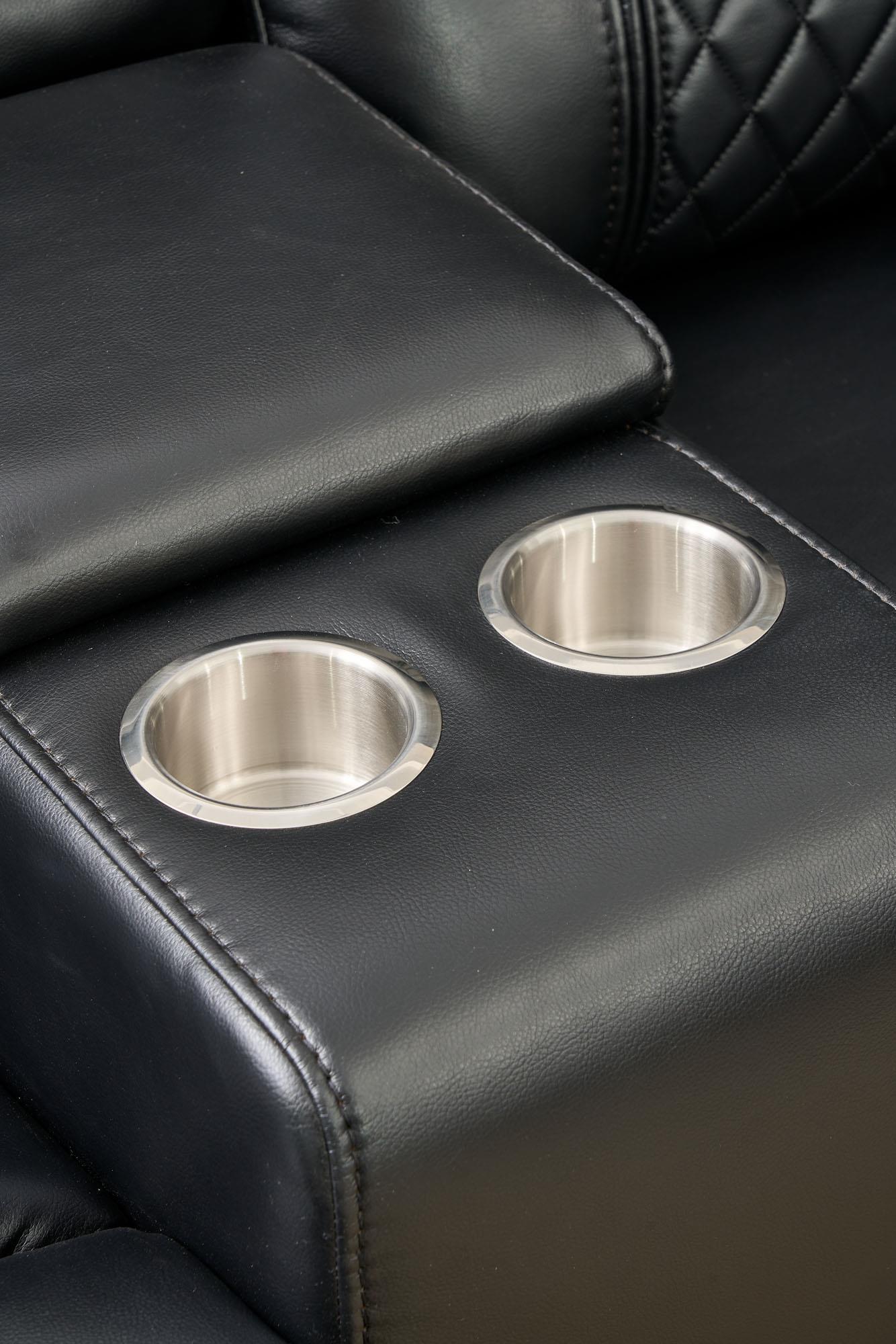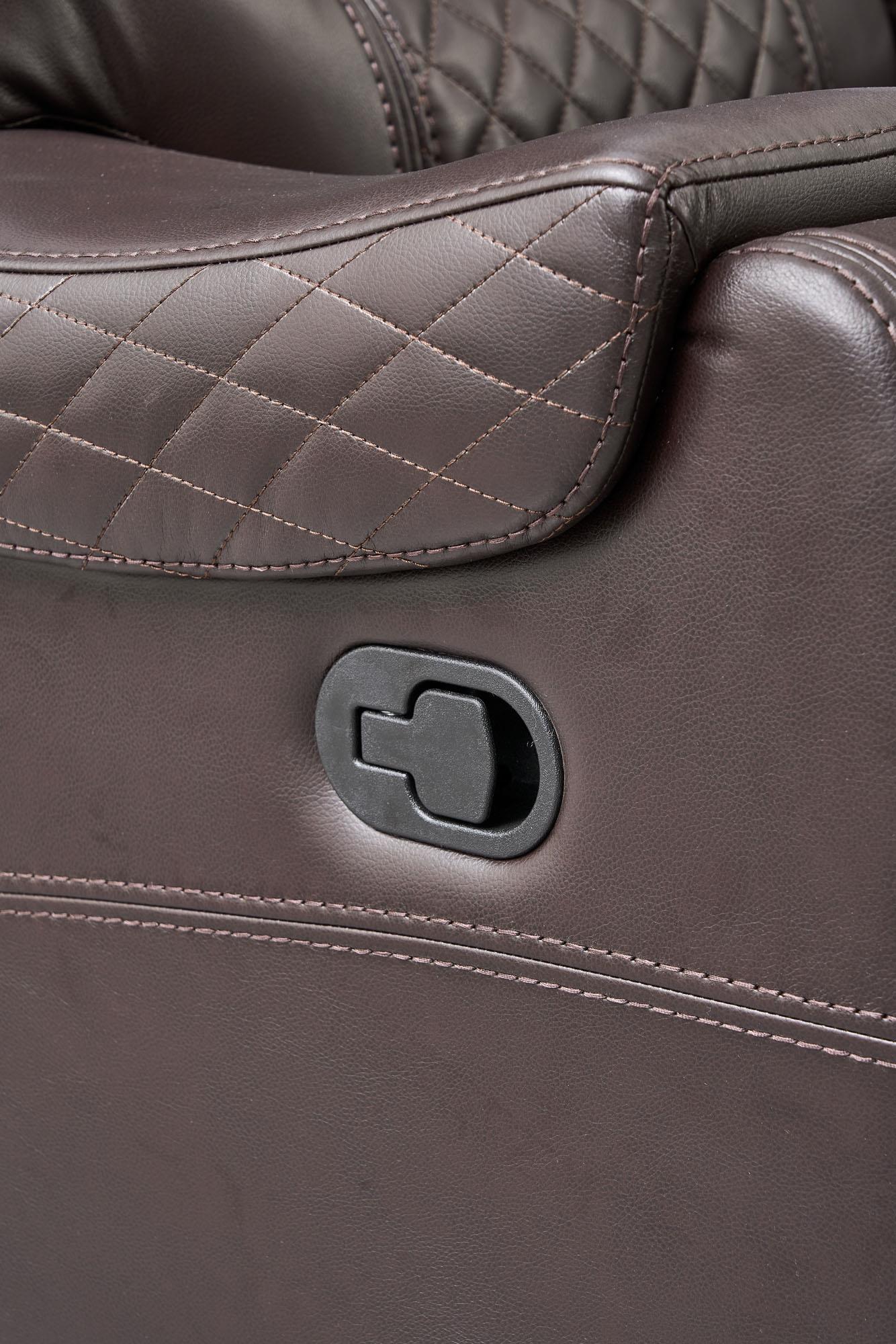 This reclining sectional is equipped with two consoles and is offered in either brown or black.